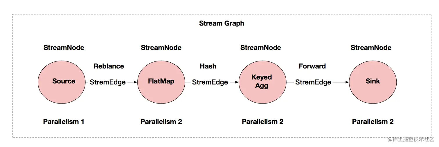 使用 DataStream API 开发的应用程序,首先被转换为 Transformation,然后被映射为 StreamGraph。