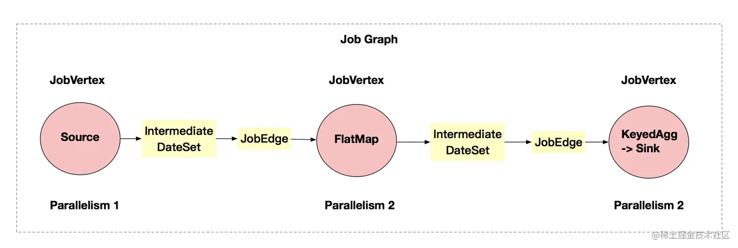 该对象和 JobGraph 中的 JobVertex 一一对应。该对象还包含一组 ExecutionVertex,数量与该 JobVertex 中所包含的 StreamNode 的并行度一致,假设 StreamNode 的并行度为3,那么 ExecutionJobVertex 也会包含 3个 ExecutionVertex。