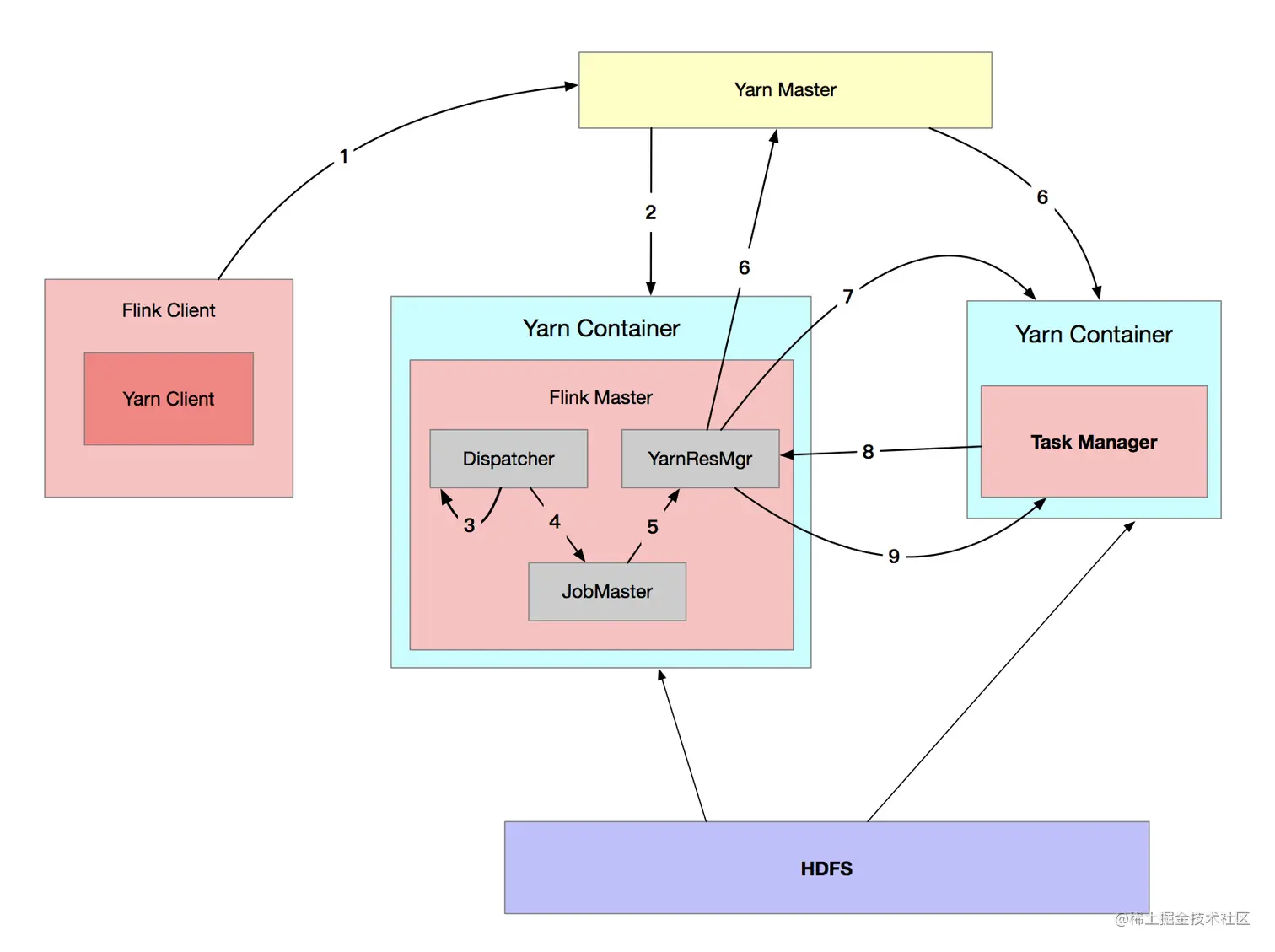 (4)YarnResourceManager 从 HDFS 加载 Jar 文件等所需的相关资源,在容器中启动 TaskManager。