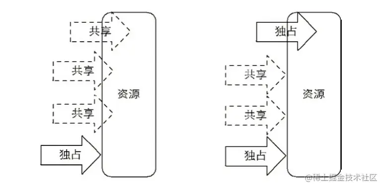 ReentrantReadWriteLock把锁进行了细化,分为了写锁和读锁,即独占锁和共享锁。独占锁即当前所有线程只有一个可以成功获取到锁对资源进行修改操作,共享锁是可以一起对资源信息进行查看。即写同时只能一个人写,读可以大家一起读。
