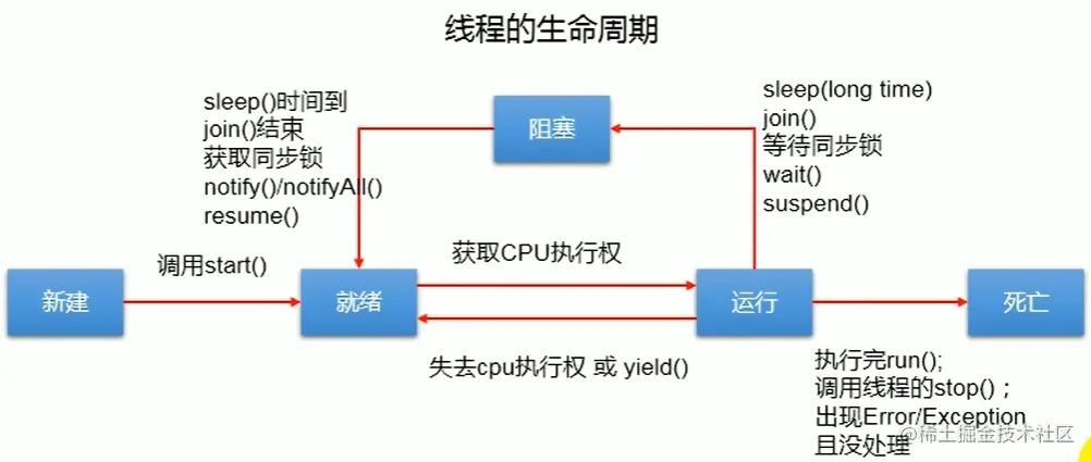 - 运行:就绪的线程被调度并获得了CPU资源