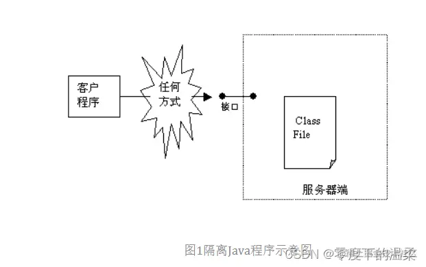 最简单的方法就是让用户不能够访问到Java Class程序,这种方法是最根本的方法,具体实现有多种方式。例如,开发人员可以将关键的Java Class放在服务器端,客户端通过访问服务器的相关接口来获得服务,而不是直接访问Class文件。这样黑客就没有办法反编译Class文件。目前,通过接口提供服务的标准和协议也越来越多,例如 HTTP、Web Service、RPC等。但是有很多应用都不适合这种保护方式,例如对于单机运行的程序就无法隔离Java程序。这种保护方式见图1所示。