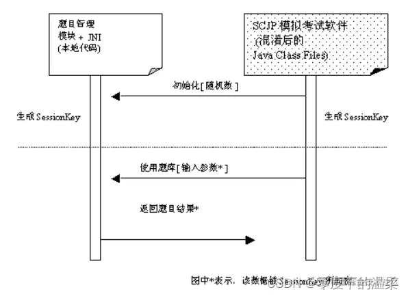 在使用题库模块之前,我们必须先调用初始化接口。在调用该接口时,客户端需要提供一个随机数作为参数。题库管理模块和客户端通过这个随机数,按一定的算法同时生成相同的SessionKey,用于加密以后输入和输出的所有数据。通过这种方式,只有授权(有效)的客户端才能够连接正确的连接,生成正确的 SessionKey,用于访问题库信息。非法的客户很难生成正确的SessionKey,因此无法获得题库的信息。如果需要建立更高的保密级别,也可以采用双向认证技术。