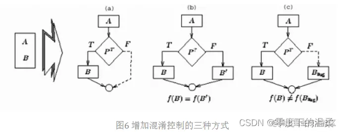 增加混淆控制通过增加额外的、复杂的控制流,可以将程序原来的语义隐藏起来。例如,对于按次序执行的两个语句A、B,我们可以增加一个控制条件,以决定B的执行。通过这种方式加大反汇编的难度。但是所有的干扰控制都不应该影响B的执行。图6就给出三种方式,为这个例子增加混淆控制。