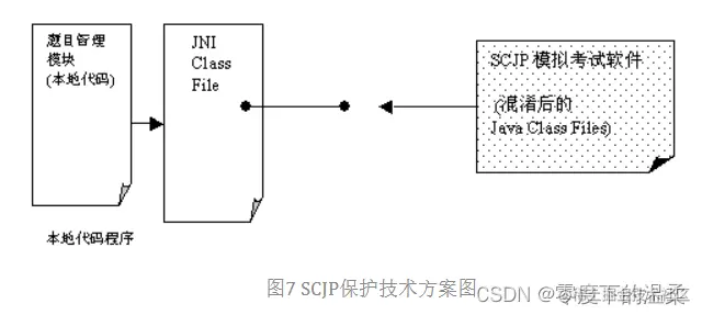 在具体的方案中,我们将程序分为两个部分,一个是由本地代码编写的题库访问的模块,另外一个是由Java开发的其它模块。这样可以更高程度地保护题目管理模块不被反编译。对于Java开发的模块,我们仍然要使用混淆技术。该方案的示意图参见图7。