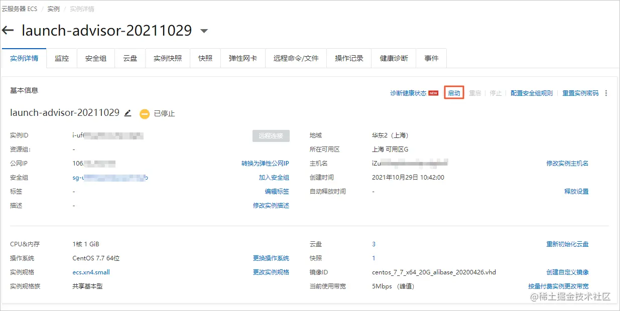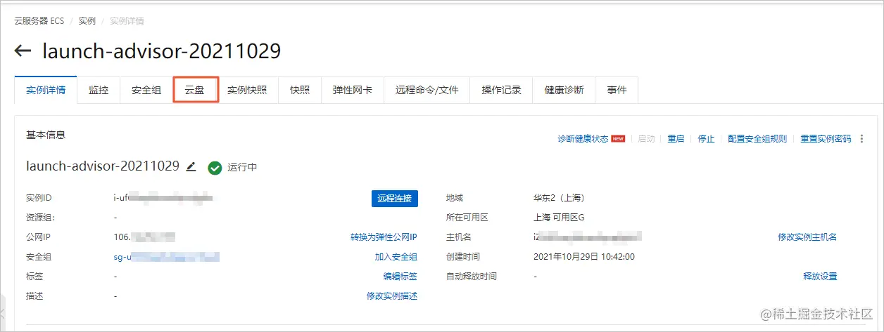 - 在实例详情页签,等待实例状态为已停止,单击云盘。