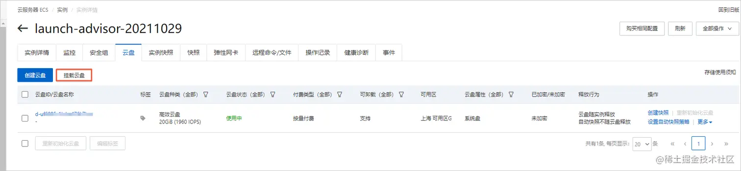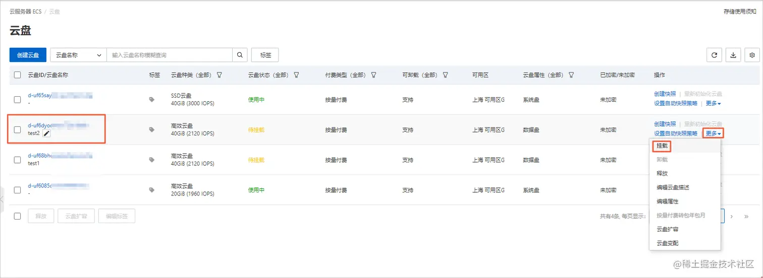 3)在云盘页面,找到您需要挂载的云盘,在操作列中,选择更多>挂载。