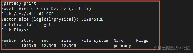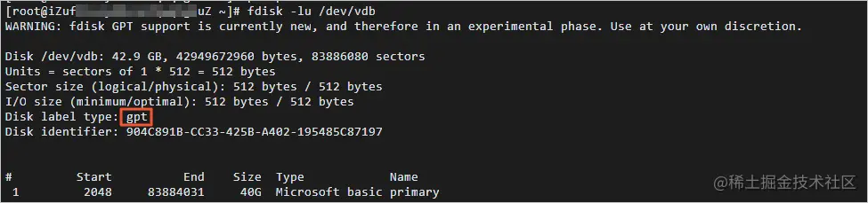 返回结果如下所示,在/dev/vdb数据盘信息中,如果出现gpt的相关信息,表示新分区已创建完成。