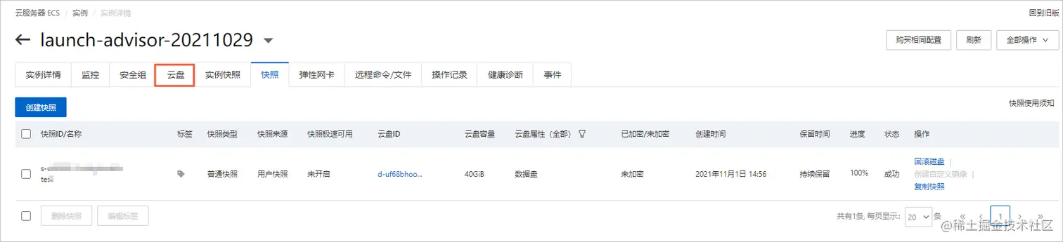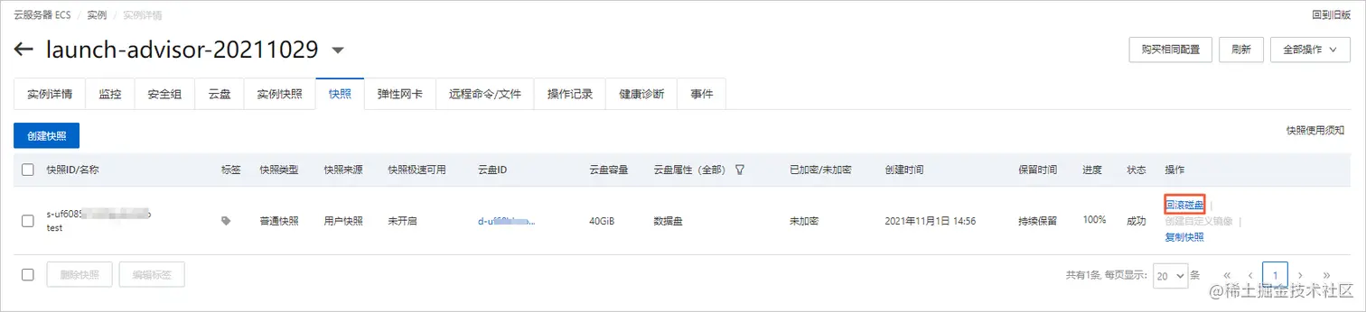 - 在快照页签,选择你需要回滚的快照,单击操作列下的回滚磁盘。