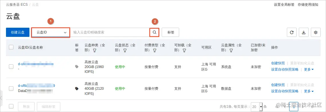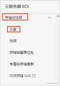1)在云服务器ECS控制台左侧导航栏中,选择存储与快照>云盘。