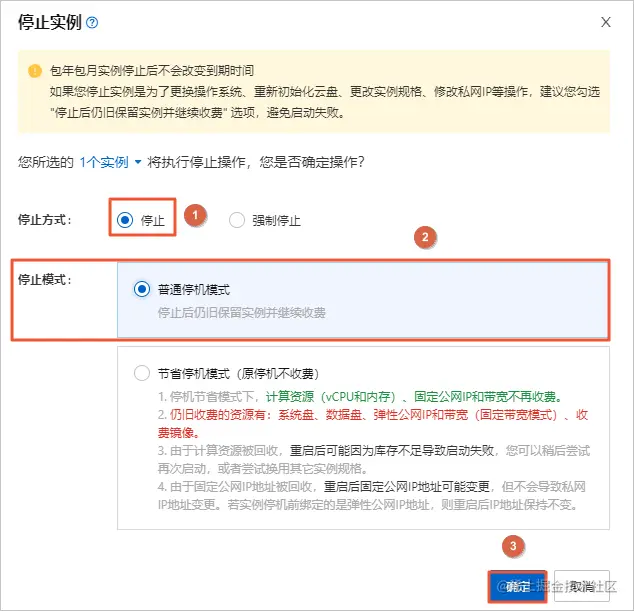 - 在停止实例对话框中,停止方式选择停止,停止模式选择普通停机,单击确定。