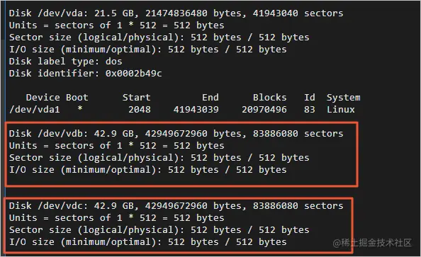 2、执行如下命令,查看实例上的两块数据盘信息。