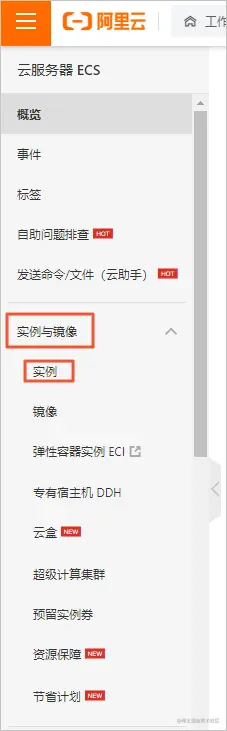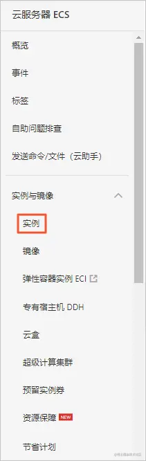 1)在云服务器ECS控制台左侧导航栏中,选择实例与镜像>实例。