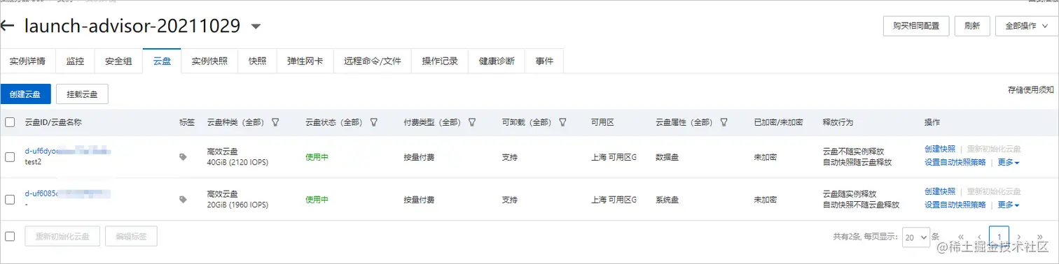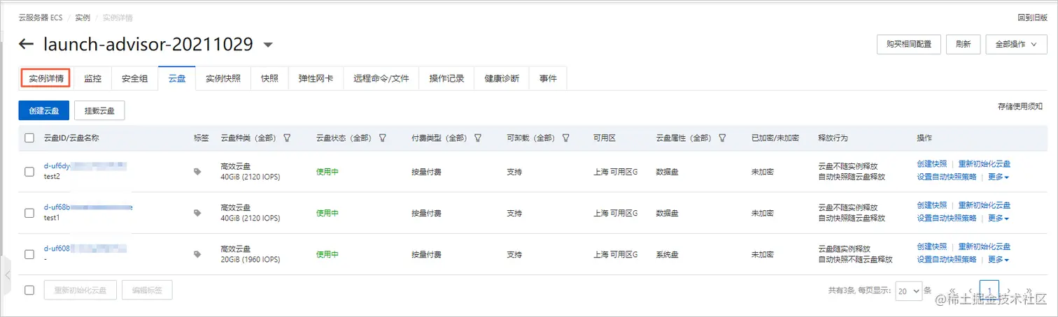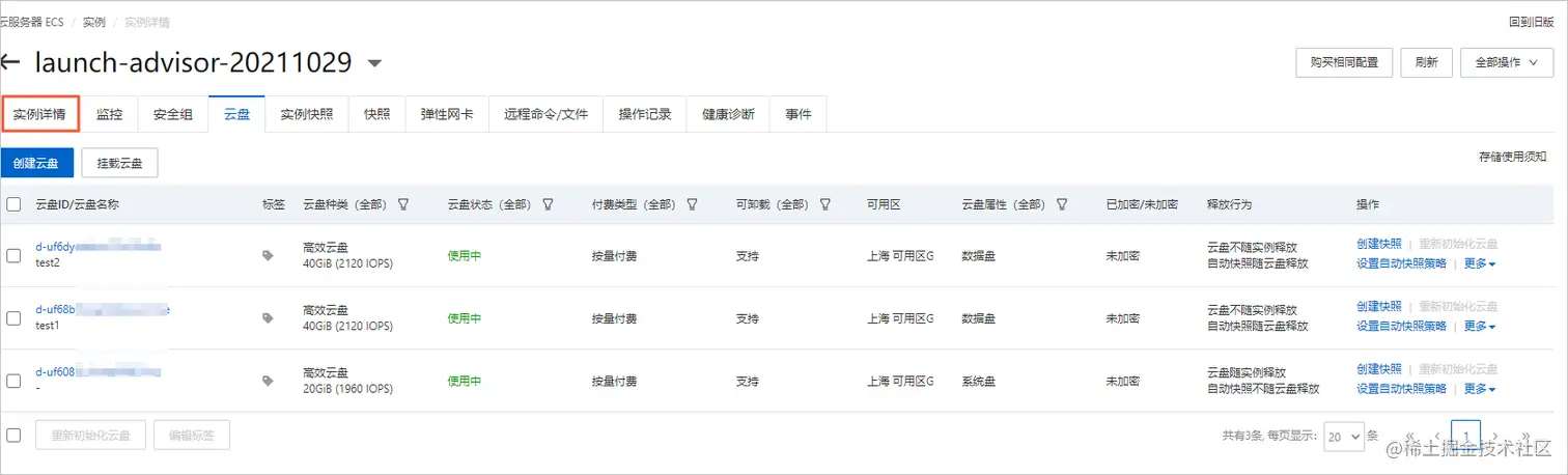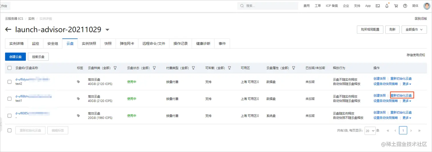 - 在云盘页签,选择您在步骤四中已创建快照的云盘,单击操作列下的重新初始化云盘。