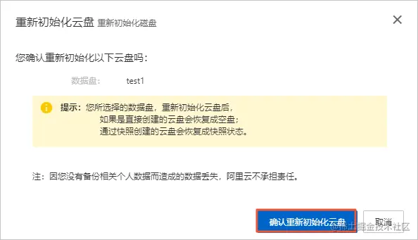 - 在重新初始化云盘对话框中,单击确认重新初始化云盘。