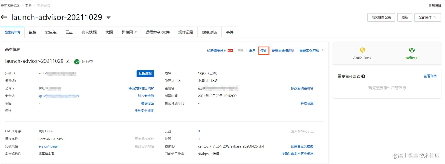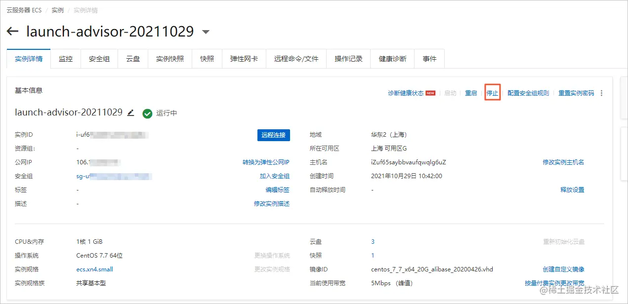 - 在实例详情页签,等待实例状态为已停止,单击快照。