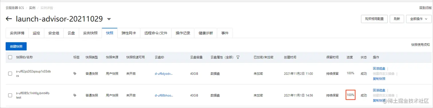 返回如下页面,您即可在快照页面查看到云盘快照的进度,等待快照进度为100%,表示快照完成。