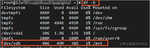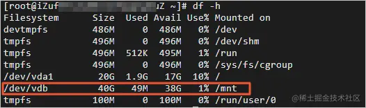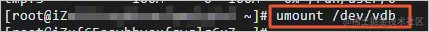 返回结果如下所示,您可以查看到需要卸载的数据盘分区/dev/vdb。