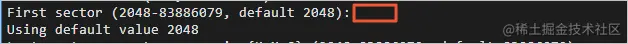 6)输入第一个可用的扇区编号,按回车键。本示例中,直接按回车键,采用默认值2048。