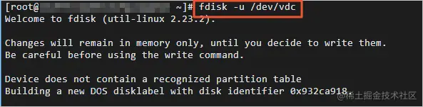 6、执行如下命令,为/dev/vdc数据盘的新分区/dev/vdc1创建一个xfs文件系统。
