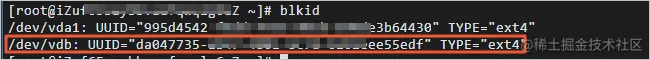 返回结果如下所示,您可以查看到数据盘分区/dev/vdb的uuid信息。
