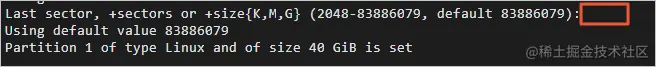 7)输入最后一个扇区编号,按回车键。本示例中,仅创建一个分区,直接按回车键,采用默认值。