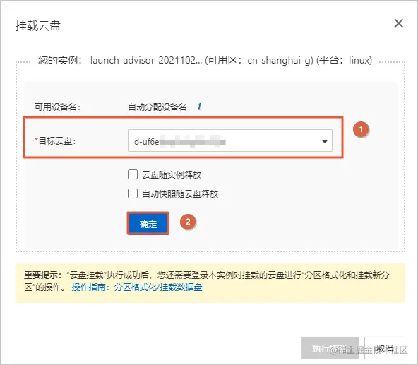 目标云盘:选择您需要挂载的云盘,本场景涉及的两个云盘都需要进行挂载。