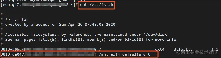- 执行如下命令,查询/etc/fstab中是否配置数据盘文件系统自动挂载信息。
