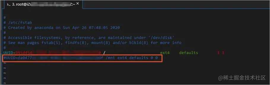 以下示例中在自动挂载信息前面添加#,表示注释掉自动挂载信息。
