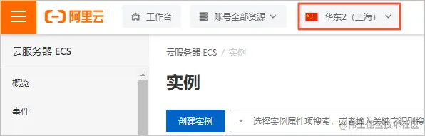 2)在实例页面顶部,选择资源所在地域。例如下图中,地域切换为华东2(上海)。
