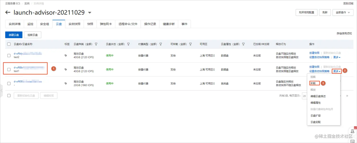- 在云盘页签,找到目标云盘,在操作列中,选择更多>卸载。