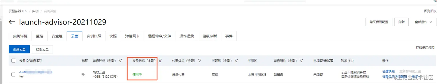 返回云盘页面,等待云盘状态变为使用中,表示挂载云盘成功。