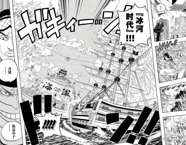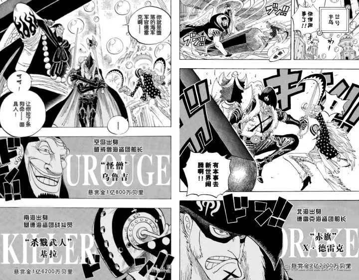 尾田荣一郎,《海贼王》498话。相关的页数较多,这里仅选两页举例
