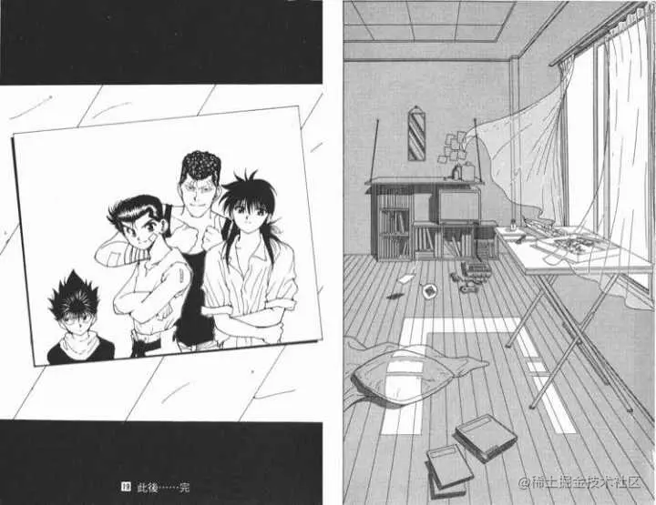 稍微偏软一些的用光,不难想到被人们津津乐道的《幽游白书》的大结局。作为「最接近分镜真理的男人」(村田雄介语),富坚在一部浓墨重彩的热血漫画的结尾反常地描绘了一幅温馨的景象。整个场景只有被微风吹动的窗帘和飘落的合影照两个运动物体。当繁华归于沉寂,一切事情都已经发生,又好似没有发生;只有友谊的羁绊会一直存续着。