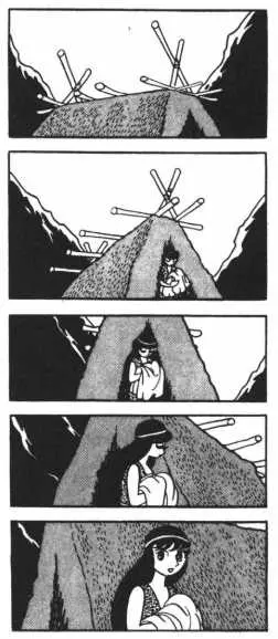 - Ⅱ用连续的5格描绘了许久未见的姐姐的出场,这5格的镜头运动同时包含了降、推和旋转。姐姐的动作是慢慢出帐,并走了几小步,旋转镜头的使用使这一人物保持在画面中心,反而是背景移动了。在旋转的同时推镜头,由中景转换到近景。