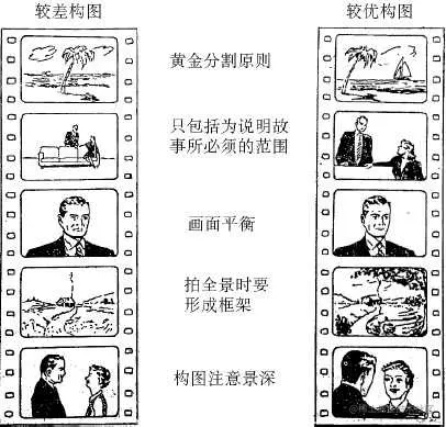 虽然如此,好的构图还是有一套标准的。对于电影而言,设计构图需要处理的首要任务就是突出主体形象。要实现这个目标,必须正确选择主体在画面中的相对位置,合理安排主体与客体、主体与环境的关系,根据需要选择拍摄角度和高度,确定画面范围,准确配置形、光、色、影调、线条等造型因素[[7]]。下图是《电影和导演》中介绍的有关构图的几点规则[[8]]。