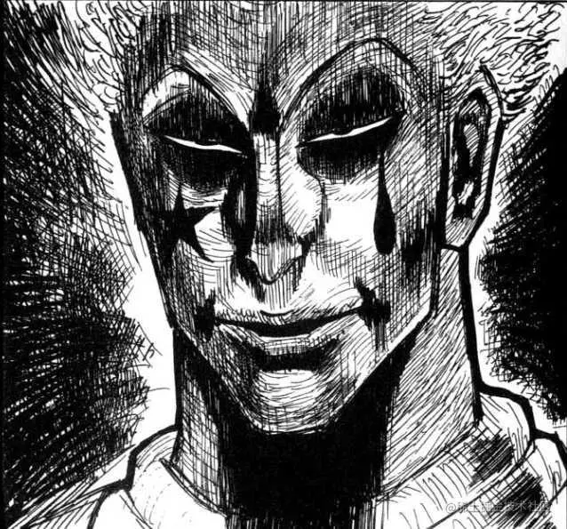 再来谈谈色彩。由于黑白漫画只存在一个色彩通道,所以色相并不容易在漫画里展现,更多是靠读者脑补。颜色的深浅如果和光影效果混杂就更难以分辨。因此,色彩的一般功能(如色彩心理学)是黑白漫画几乎不得不摒弃的一个东西。但是,黑白漫画利用明暗效果也可以创造出独特的感觉。这里还是拿富坚举例,《全职猎人》里亦正亦邪的西索,在杀意泛起时是这样的: