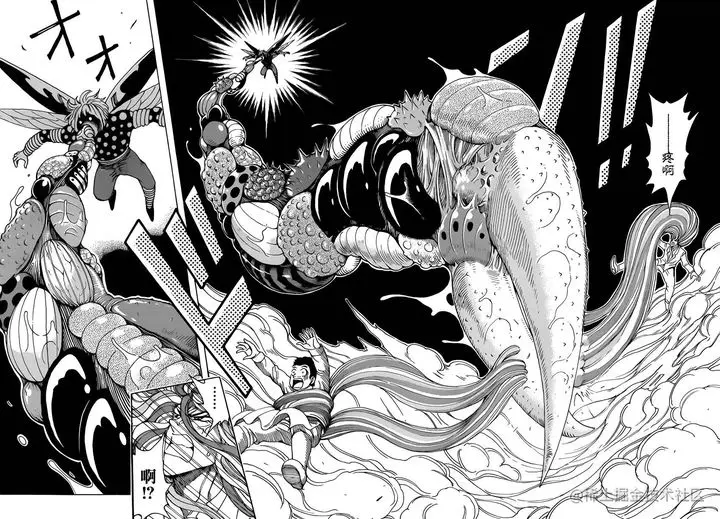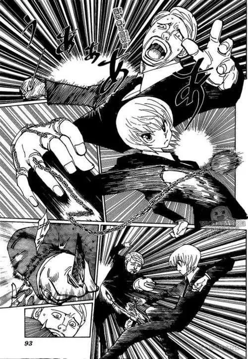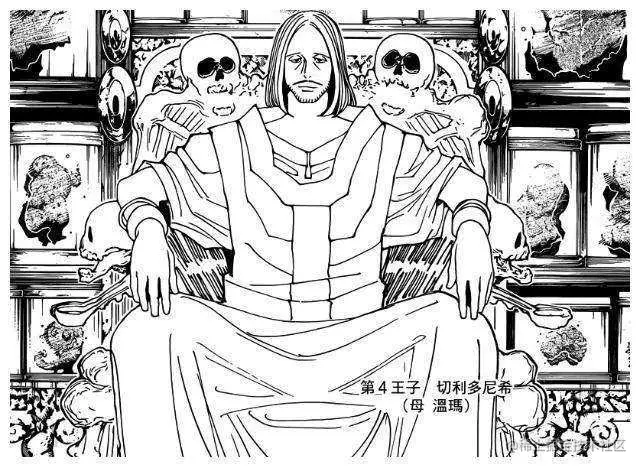 富坚义博,《全职猎人》。十字型构图给人一种稳定感,突出了反派的气势,暗示其难搞的程度