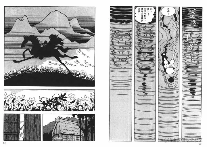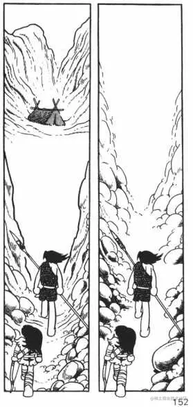 对于开放式构图,大家可以猜测一下是什么年代引入漫画领域的。实际上,至少在60年代末,手冢的《火之鸟·凤凰篇》中就已经有很精彩的范例了!