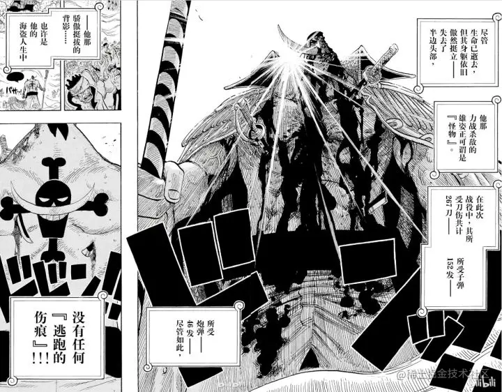 《海贼王》里另一个精心设计过光影的范例就是白胡子之死。强烈的阳光从头部左侧照射进来,造成了大逆光和轮廓光,把伤痕被笼罩在阴影下,而阳光照射的背面却是没有伤痕的。结合仰角更加突出了主体的伟岸。