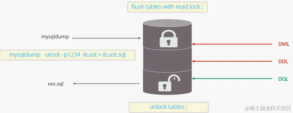 对整个数据库实例进行加锁,使用场景:全库的逻辑备份,保证数据的完整性,在此期间,所有DML语句都是阻塞的,而DQL不受影响