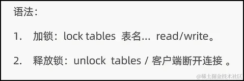 - 写锁加上之后,只允许当前连接进行读写操作,其他连接不允许读写操作