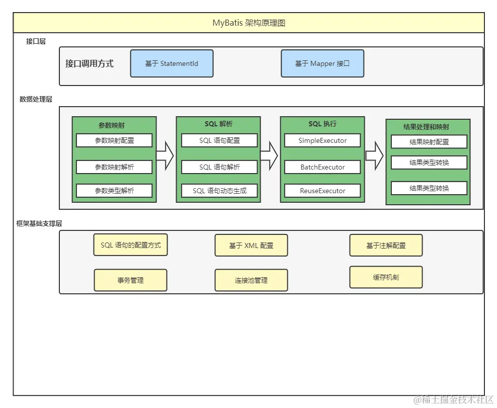 开发人员通过调用这些 API 来操作数据库。当接口层接收到请求就会调用数据处理层来完成具体的数据处理。比如:我们执行了 sqlSession.selectList,当我们在执行这个语句的时候,其底层会调用数据处理层,数据处理层会去真正的完成 sql 的执行,所以说 MyBatis 其本身就是对 JDBC 的一个封装,其底层的还是 JDBC。为了能执行成功,需要进行、参数的设置、SQL 的预编译,SQL 的执行以及结果集封装和映射。