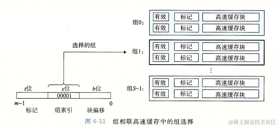 首先高速缓存必须搜索组中的每一行, 寻找一个有效的行,其标记与地址中的标记相匹配 。如果高速缓存找到了这样一行(命中),通过块偏移索引到具体位置。