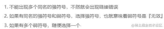 而如果是不同文件的同名全局变量,则会按照强弱符号去判断,然后根据三个规则去处理