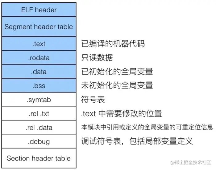 上面提到的三种对象文件有统一的格式,即 Executable and Linkable Format(ELF),因为,我们把它们统称为 ELF binaries,具体的文件格式如下