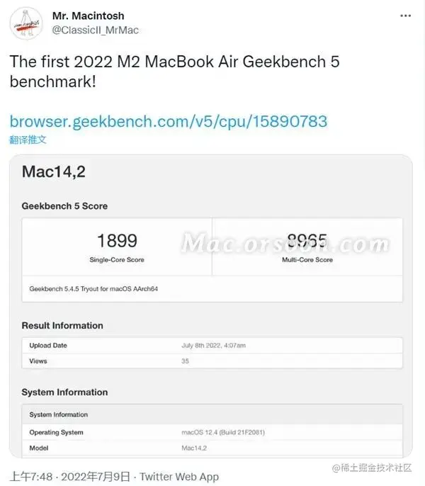 在推特上发现的Geekbench 5跑分中,搭载M2芯片和16GB统一内存的MacBook Air的单核得分为1,899分,多核得分为8,965分。这些分数与配备M2芯片的13英寸MacBook Pro获得的分数大致相同,证实了这两款笔记本在测试中的表现几乎相同,就像M1型号一样。