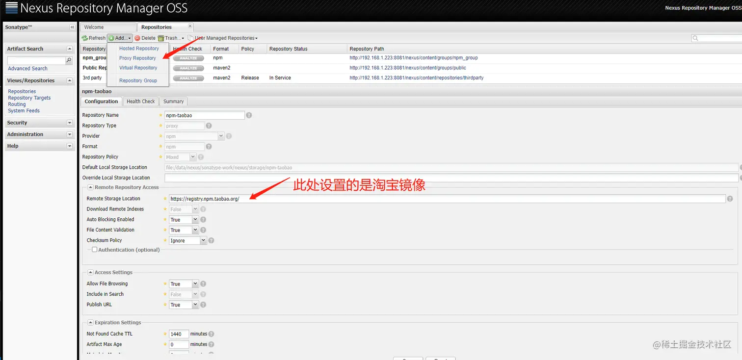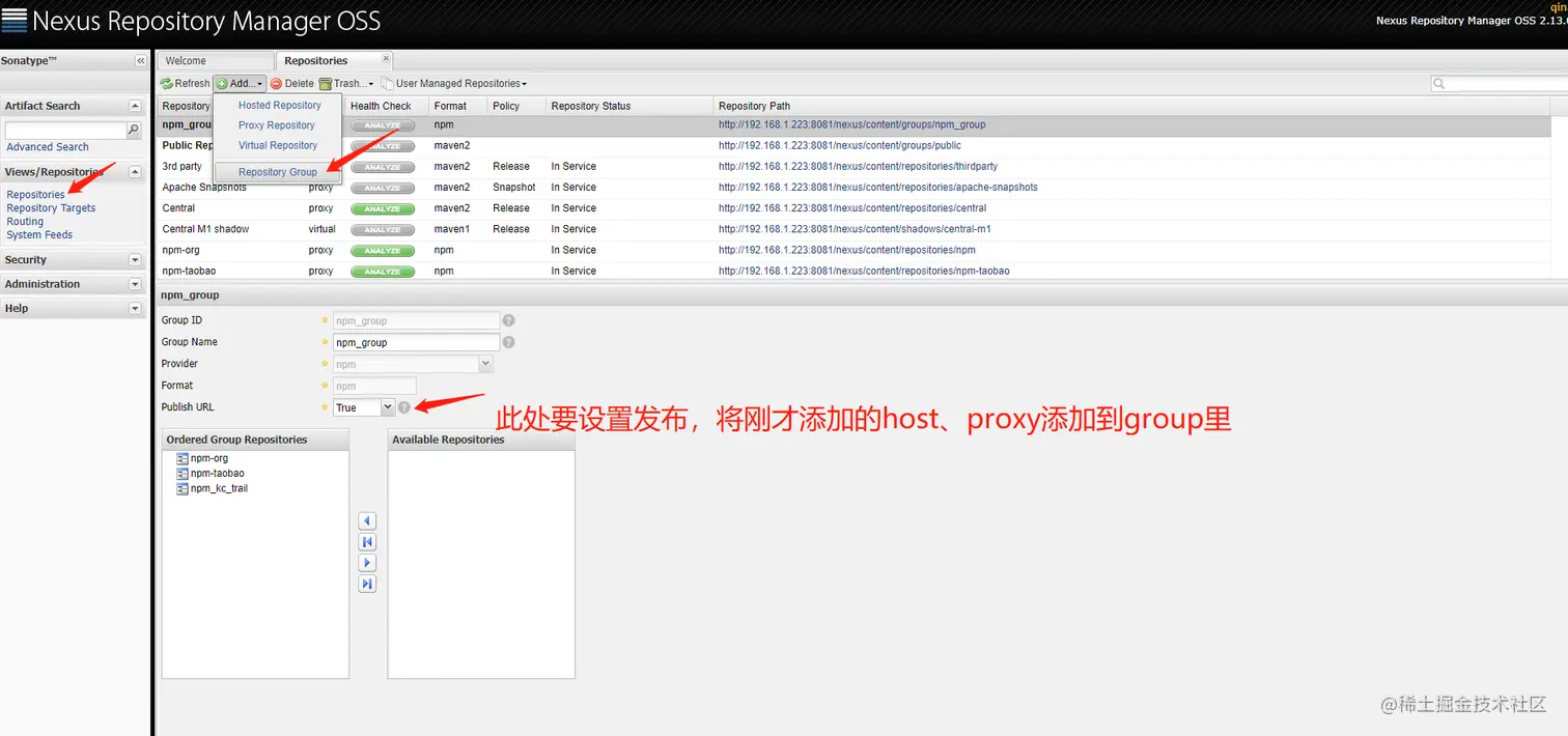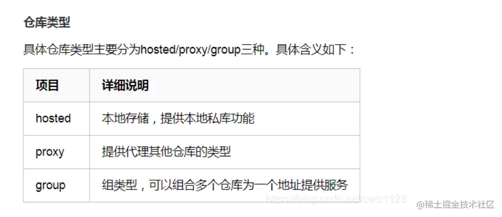 group仓库组:nexus通过仓库组统一管理多个仓库,简单来说就是我们可以上传私有组件或插件到host以及配置proxy以获取第三方的依赖(配置中央仓库的地址),group会提供一个用户可访问的地址。