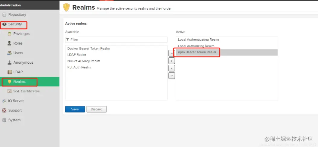 写到这里,想必各位看官已经发现问题了,为什么一般我们在发布源为registry.npmjs.org/的时候不需要这样做,而是直接npm login然后输入用户名密码,并且不需要转base64,但是在Nexus上却需要,这其实牵扯到一个Nexus版本问题,Nexus2上没有配置npm Bearer Token权限的地方,但是在Nexus3上是有的如下所示: