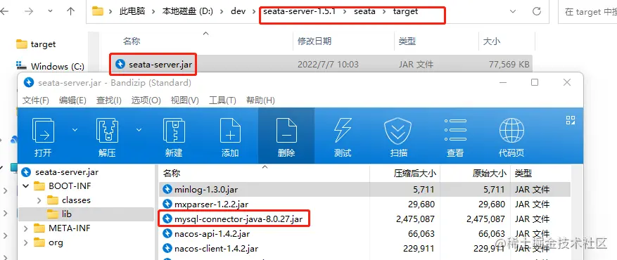 找到seata-server模块编译生成的jar文件(seata\server\target\seata-server-版本号.jar),替换到中间件安装路径seata-server-1.5.1\seata\target目录下的jar包。
